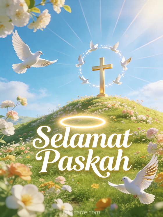 Rayakan sukacita Paskah dengan kartu religius yang bercahaya ini yang menampilkan salib emas dikelilingi merpati putih di bukit musim semi. Lihat juga kartu religius selamat Paskah.
