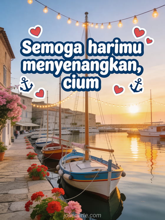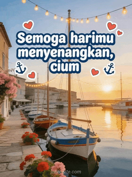 Cerahkan hari seseorang dengan kartu Mediterania yang menawan ini yang menampilkan pelabuhan indah dengan perahu layar berwarna-warni, geranium merah, buganvil dan lampu hias di antara tiang-tiang. Temukan juga kartu hari yang indah dengan cium atau kartu selamat pagi animasi.