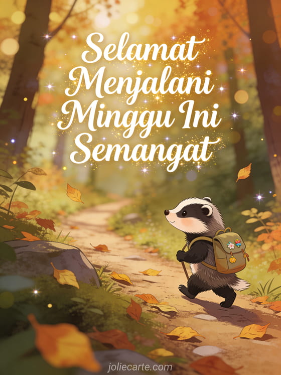 Bangkitkan semangat orang-orang tersayang dengan kartu yang menyemangati ini yang menampilkan badger kecil yang bersemangat mendaki jalur hutan dengan ransel kecilnya. Temukan juga kartu selamat minggu yang lucu atau kartu selamat minggu yang menyenangkan.