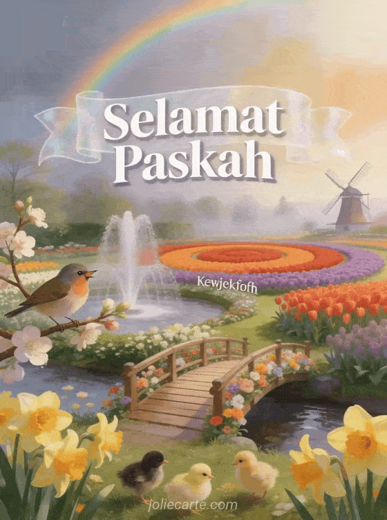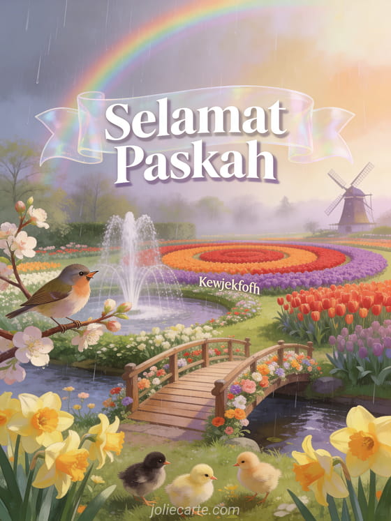 Rayakan Paskah dengan kartu ucapan animasi gratis menawan ini yang menampilkan seekor burung bernyanyi di dahan berbunga di samping air mancur taman Keukenhof dengan hamparan tulip, jembatan kayu, dan anak ayam di antara bunga bakung dengan pelangi. Temukan juga carte virtuelle paques carte gratuite joyeuses paques.