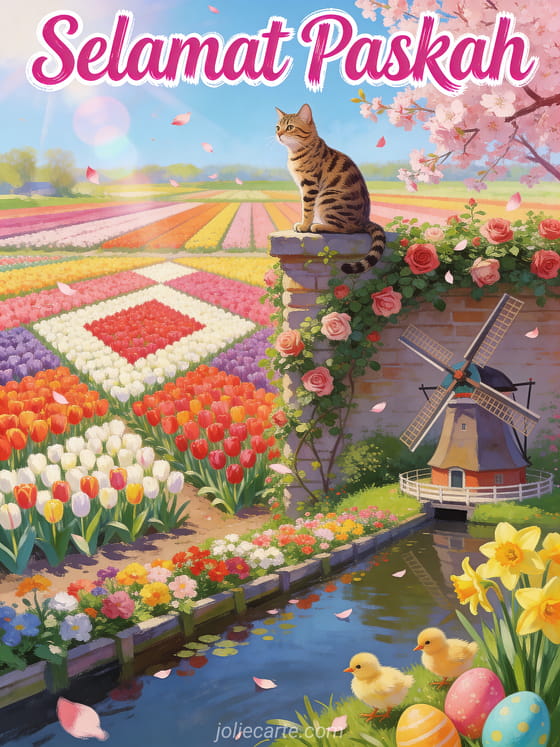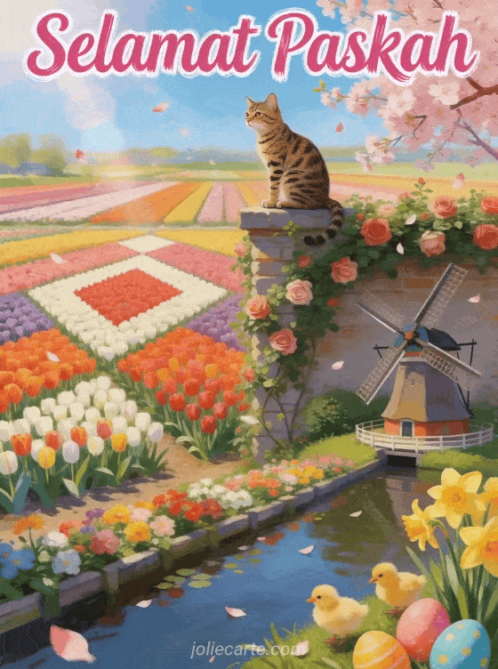 Rayakan Paskah dengan kartu ucapan animasi gratis menawan ini yang menampilkan kucing Bengal di atas dinding taman berhias mawar menghadap ladang tulip Keukenhof dengan anak ayam Paskah dan telur hias di bawah bunga sakura. Temukan juga cartes de pâques gratuites pour facebook cartes pour paques.