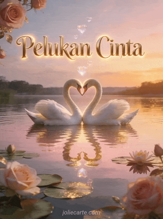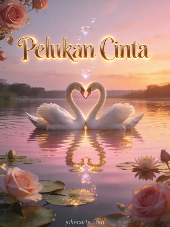 Kirim kartu pelukan cinta megah ini dengan dua angsa membentuk hati dengan leher mereka di danau tenang saat matahari terbenam dengan pantulan pink dan emas di air dan hati tembus pandang melayang di atas teratai yang bermekaran. Cara romantis untuk mengungkapkan cintamu. Temukan juga kartu pelukan cinta besar atau kartu pelukan penghibur.