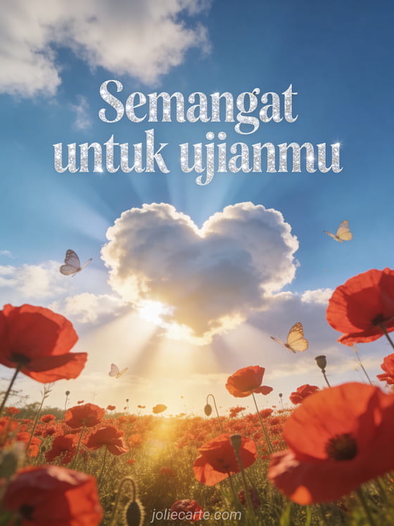 Kirimkan pesan hangat dan menyemangati kepada seseorang yang sedang mempersiapkan ujian dengan kartu indah ini yang menampilkan langit biru, awan berbentuk hati dan padang bunga poppy merah.