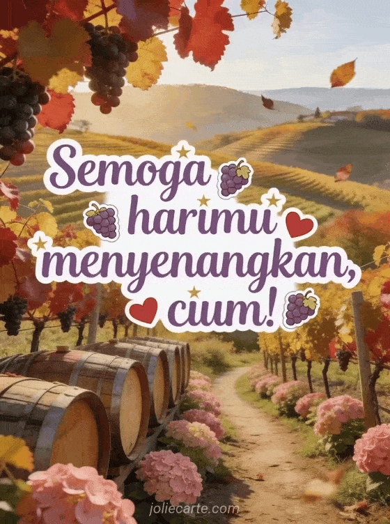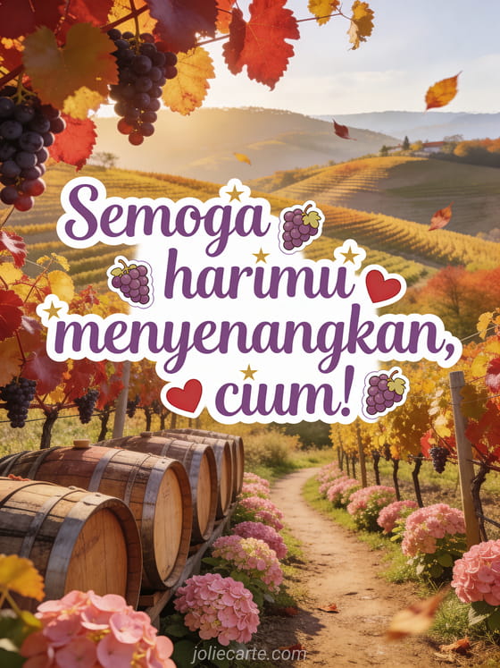 Cerahkan hari seseorang dengan kartu hangat ini yang menampilkan perbukitan kebun anggur di musim gugur, daun anggur merah dan emas, hydrangea merah muda dan cahaya emas musim gugur. Temukan juga kartu selamat pagi animasi atau kartu selamat pagi dengan matahari.
