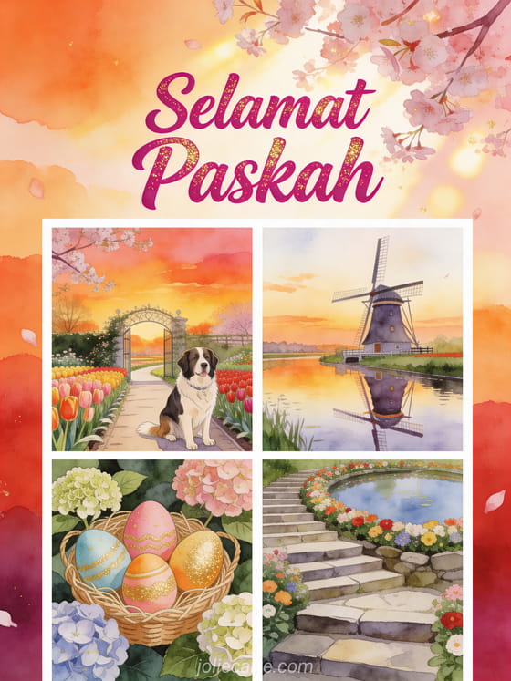 Rayakan Paskah dengan kartu ucapan animasi gratis menawan ini yang menampilkan seekor Australian Shepherd di pintu masuk jalur taman Keukenhof dengan tulip bernuansa senja, kincir angin Belanda tercermin di kanal, dan telur Paskah di antara hydrangea. Temukan juga cartes virtuelles joyeuses paques carte virtuelle gratuite paques.