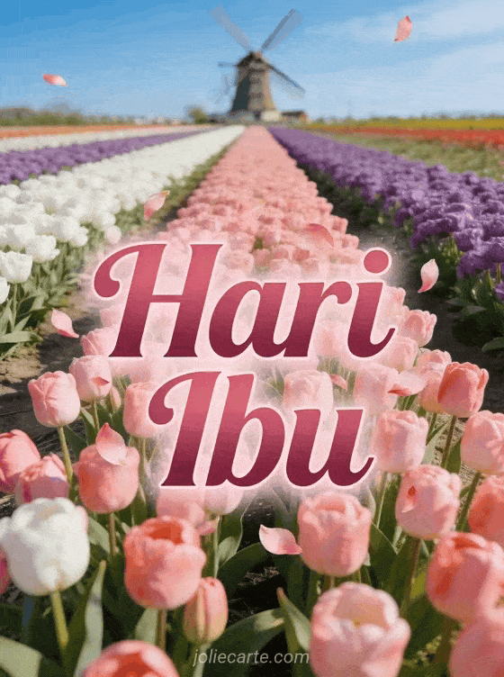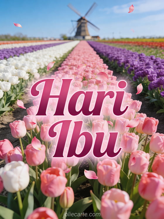 Rayakan Hari Ibu dengan kartu ucapan gratis yang semarak ini. Pemandangan fotorealistis menampilkan barisan tulip merah muda, putih dan ungu di taman Belanda dengan kincir angin yang kabur di latar belakang di bawah langit biru musim semi. Temukan juga kartu gratis untuk Hari Ibu, kartu dengan foto untuk Hari Ibu atau kartu bunga untuk Hari Ibu.