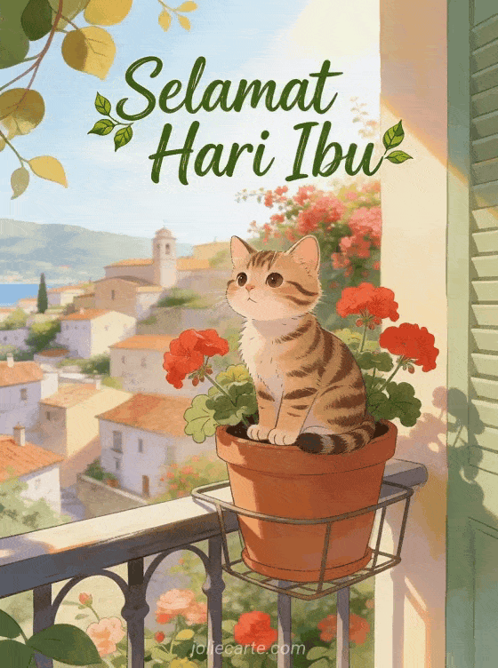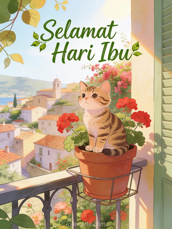 Rayakan ibu dengan kartu ucapan gratis yang ceria ini. Ilustrasi yang menawan menampilkan kucing belang yang duduk di pot geranium merah di balkon yang cerah dengan pemandangan desa Mediterania, dengan bougenville di latar belakang. Temukan juga kartu dengan foto untuk Hari Ibu, kartu bunga untuk Hari Ibu atau kartu untuk Hari Ibu.