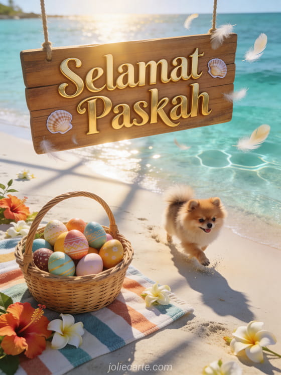 Kirim kartu Paskah virtual gratis yang indah ini dengan pantai saat matahari terbenam, anjing Pomeranian bermain di pasir di samping keranjang telur Paskah yang dihias. Bunga kembang sepatu dan melati menambah sentuhan tropis. Temukan juga kartu hari raya Paskah, kartu virtual Paskah atau kartu Selamat Paskah.