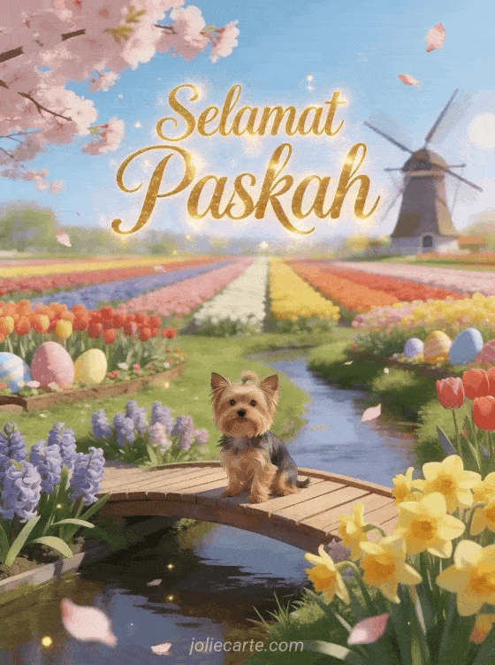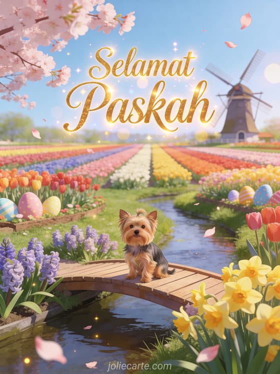 Rayakan Paskah dengan kartu ucapan animasi gratis menawan ini yang menampilkan seekor Yorkshire Terrier di jembatan kayu melintasi sungai dihiasi bunga hyacinth dan bakung di Keukenhof dengan tulip warna-warni, kincir angin Belanda, dan kelopak sakura. Temukan juga cartes de joyeuses fetes de paques texte carte de voeux pâques.