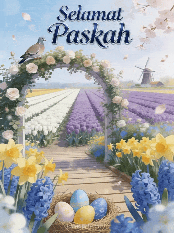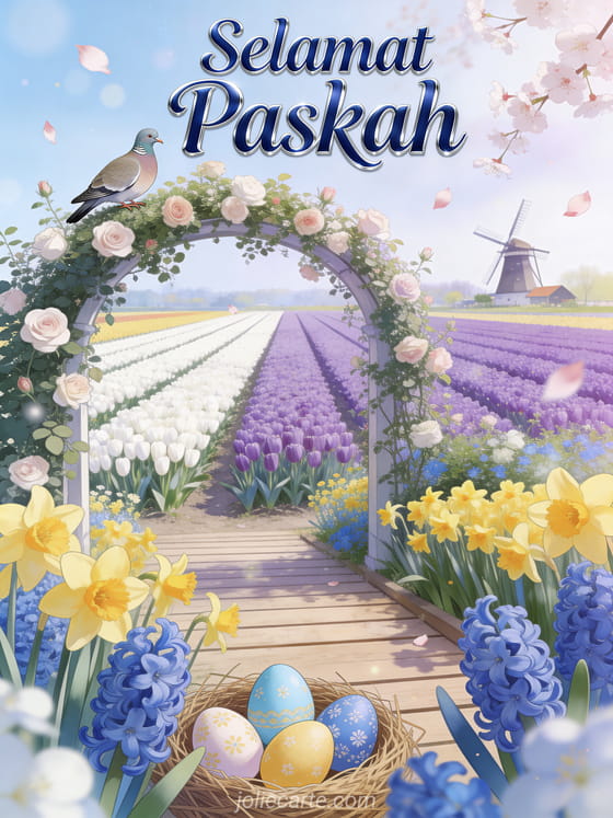 Rayakan Paskah dengan kartu ucapan animasi gratis menawan ini yang menampilkan seekor burung tekukur di gerbang taman berhias mawar di Keukenhof dengan ladang tulip putih dan ungu, telur Paskah dalam sarang, dan kincir angin Belanda. Temukan juga carte virtuelle gratuite paques gifs joyeuses paques.