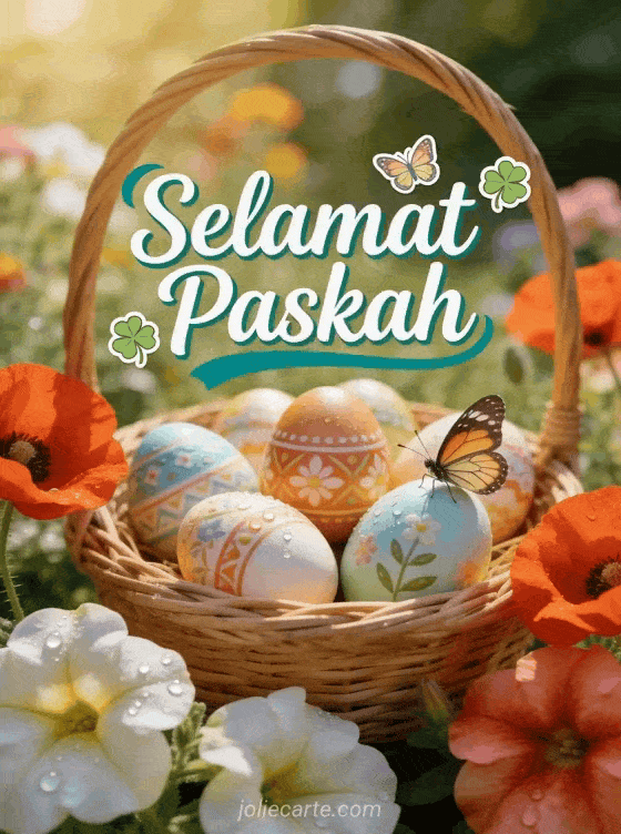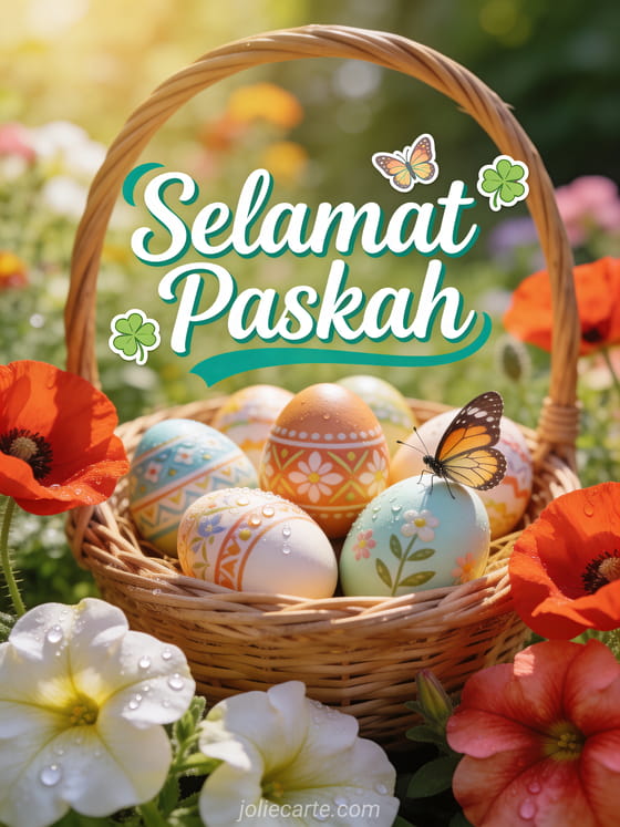Kirim kartu virtual Paskah gratis ini dengan foto indah keranjang telur Paskah yang dihias di antara bunga poppy dan petunia, embun pagi di kelopak bunga dan kupu-kupu yang hinggap di telur. Kualitas profesional. Temukan juga kartu Paskah, kartu Paskah gratis atau kartu ucapan Paskah.