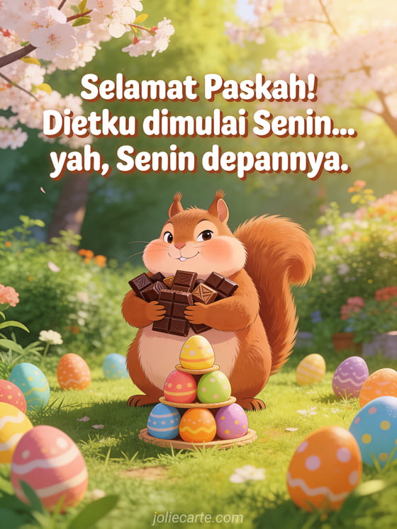 Ucapkan Selamat Paskah dengan humor lewat kartu ucapan gratis ini. Seekor tupai gemuk dengan pipi penuh cokelat yang tidak bisa menahan godaan Paskah. Sempurna untuk membuat tersenyum dan berbagi kebahagiaan Paskah dengan ringan.
