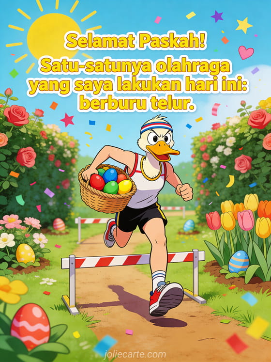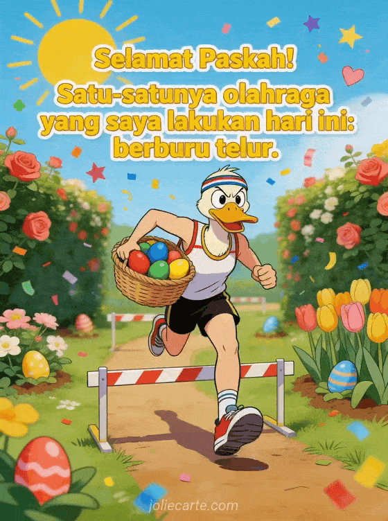 Kirimkan GIF Paskah yang menghibur dengan bebek sporty yang berlari di taman mencari telur. Satu-satunya olahraga yang layak hari ini! Temukan juga kartu Senin Paskah lucu atau gambar Paskah lucu dan kartu Paskah humoristik.