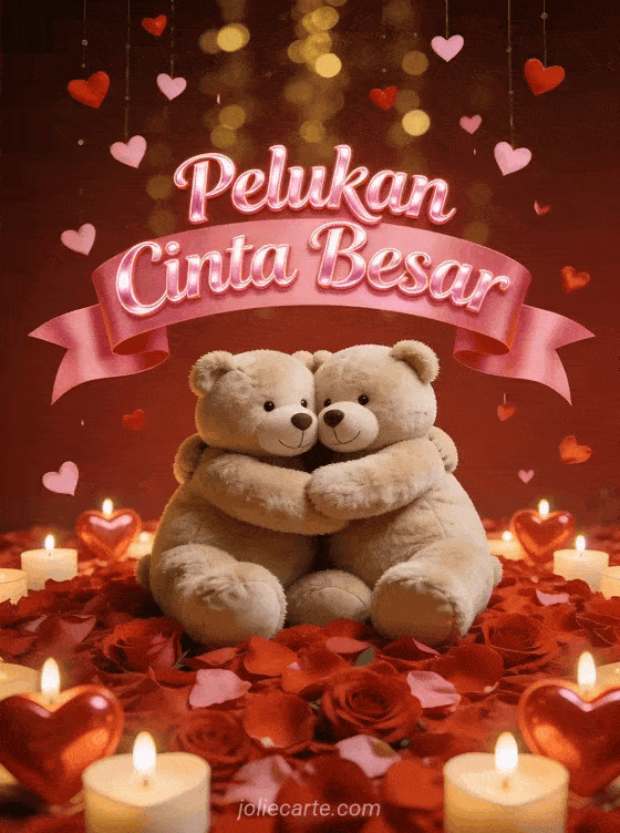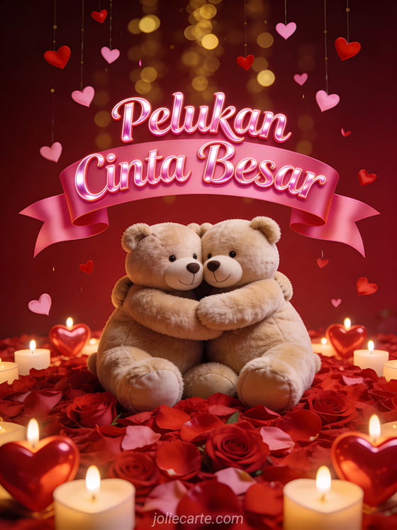 Kirim kartu pelukan penuh gairah ini dengan dua boneka beruang raksasa berpelukan di atas hamparan kelopak mawar merah dikelilingi lilin berbentuk hati dan hati kecil merah dan pink yang berjatuhan seperti hujan cinta. Cara romantis untuk mengirim pelukan hangat. Temukan juga kartu pelukan cinta dengan angsa atau kartu pelukan penghibur.