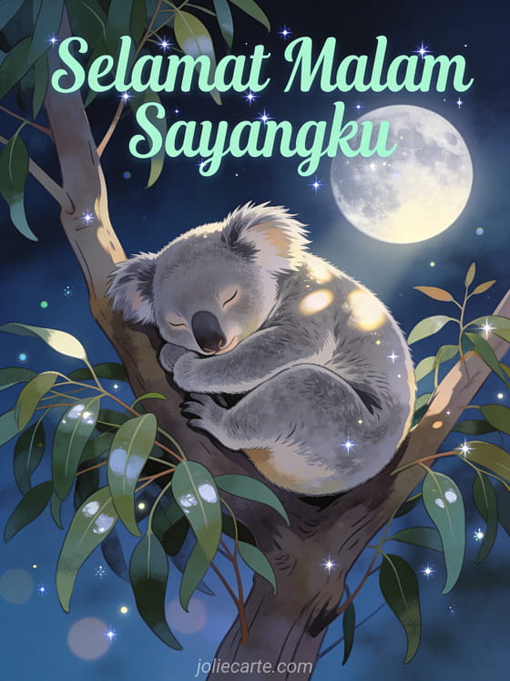 Ucapkan mimpi indah untuk kekasihmu dengan kartu Selamat Malam Sayangku yang damai menampilkan koala lucu tidur di pohon eukaliptus di bawah cahaya bulan. Temukan juga kartu selamat malam sayang atau kartu selamat malam romantis.