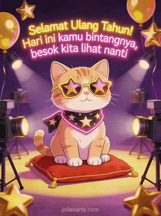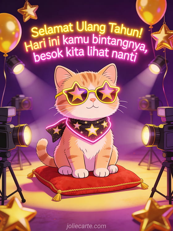 Kirim kartu ulang tahun lucu ini dengan anak kucing memakai kacamata berbentuk bintang duduk di karpet merah miniatur dikelilingi kilatan kamera dan balon bintang emas. Cara seru untuk merayakan ulang tahun seorang anak. Temukan juga kartu ulang tahun dengan anak anjing atau kartu ulang tahun untuk anak perempuan.
