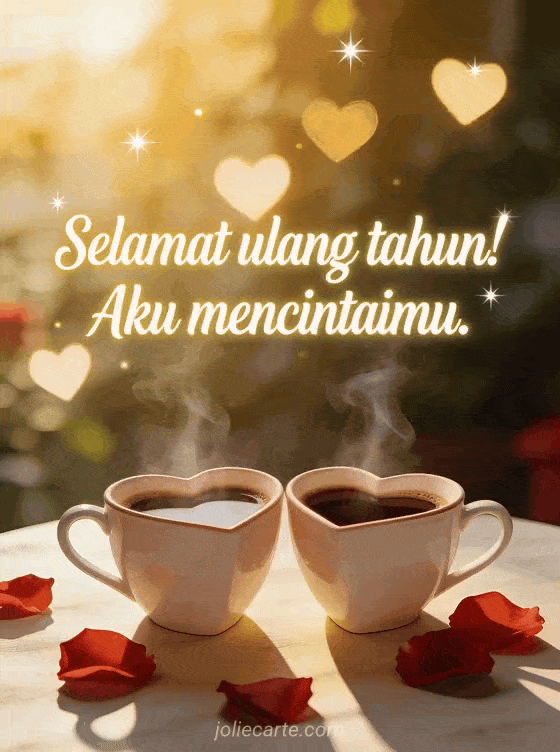 Ucapkan âAku mencintaimuâ dengan kartu ulang tahun yang indah ini. Dua cangkir kopi berbentuk hati dan kelopak mawar merah menciptakan suasana intim dan penuh kasih. Temukan juga kartu ulang tahun lucu atau kartu ulang tahun dengan champagne.