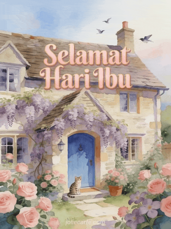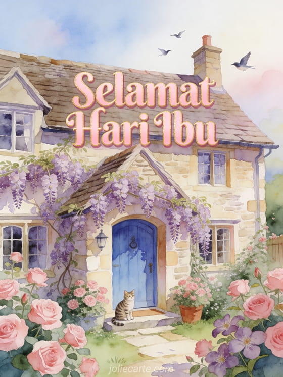 Rayakan Hari Ibu dengan kartu ucapan gratis yang indah ini. Ilustrasi cat air yang hangat menampilkan cottage batu Inggris yang menawan dengan pintu biru, dikelilingi mawar merah muda dan clematis ungu, dengan kucing belang yang menggemaskan di depan pintu. Temukan juga kartu dengan gambar untuk Hari Ibu, kartu dengan gambar untuk ibu atau kartu bunga untuk Hari Ibu.