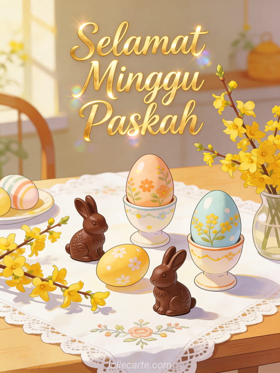 Rayakan Minggu Paskah dengan kartu hangat ini menampilkan meja pesta dengan telur hias, kelinci cokelat, dan bunga forsythia dalam cahaya pagi yang hangat. Temukan juga kartu Senin Paskah, kartu akhir pekan Paskah, atau ucapan akhir pekan Paskah.