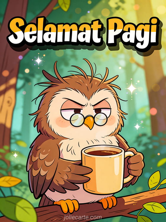 Mulai hari seseorang dengan senyuman dengan kartu selamat pagi yang lucu ini. Seekor burung hantu cemberut dengan kacamata bulat kecil memegang cangkir kopi raksasa, dengan bulu berantakan dan ekspresi mengantuk di hutan kartun.