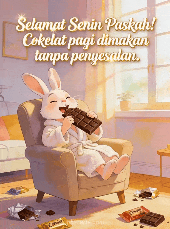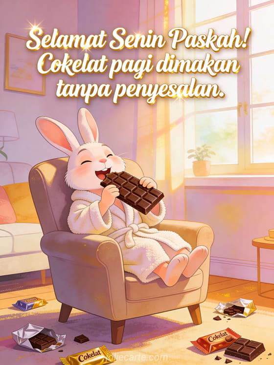 Kirimkan ucapan Senin Paskah yang menghibur dengan kelinci nyaman yang menikmati sebatang cokelat raksasa tanpa penyesalan. Temukan juga gambar Paskah lucu atau kartu Paskah humoristik dan ucapan Paskah humor wanita.