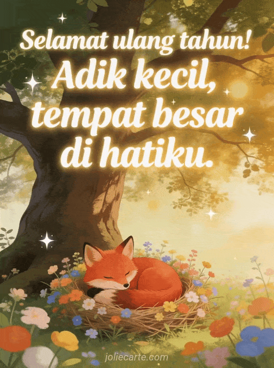 Rayakan ulang tahun adik Anda dengan kartu lembut ini menampilkan rubah merah menggemaskan bersembunyi di antara bunga liar musim semi warna-warni di bawah pohon ek besar, cahaya emas tersaring dan bintang berkedip. Temukan juga kartu gif ulang tahun kakak perempuan atau teks ulang tahun untuk saudari.