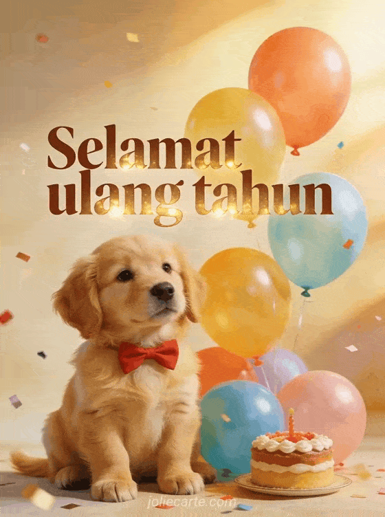 Cerahkan ulang tahun seseorang dengan kartu menawan ini yang menampilkan anak anjing golden retriever lucu berdasi kupu-kupu merah di samping balon warna-warni dan kue kecil, cahaya emas hangat dan confetti. Temukan juga kartu ulang tahun dengan kucing atau kartu ulang tahun dengan kembang api.