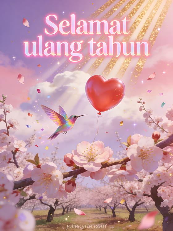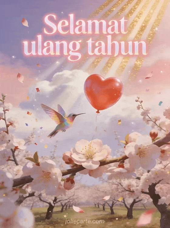Rayakan ulang tahun istimewa dengan kartu menawan ini yang menampilkan kebun plum berbunga di bawah langit pastel, kolibri berkilau dan balon hati merah mengambang di antara dahan. Temukan juga gambar gratis selamat ulang tahun atau gif ulang tahun dengan bunga.