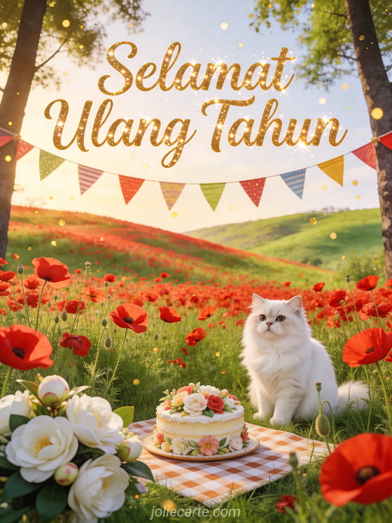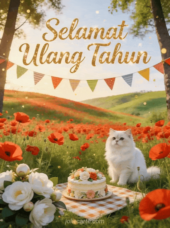 Rayakan ulang tahun dengan kartu pedesaan menawan ini yang menampilkan kucing Persia putih duduk di antara bunga poppy merah di bukit hijau, kamelia putih, bendera warna-warni, kue berhias bunga di atas taplak kotak-kotak dan partikel emas dalam cahaya hangat sore hari. Temukan juga kartu ulang tahun animasi atau kartu ulang tahun dengan mobil antik.
