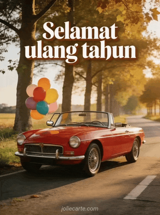 Kirim kartu selamat ulang tahun yang menawan ini dengan mobil klasik merah konvertibel yang diparkir di jalan pedesaan yang diapit pepohonan, dengan balon-balon berwarna yang diikat di spion, disinari cahaya keemasan senja. Temukan juga kartu ucapan ulang tahun bergaya akuarel.