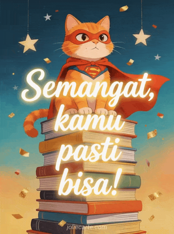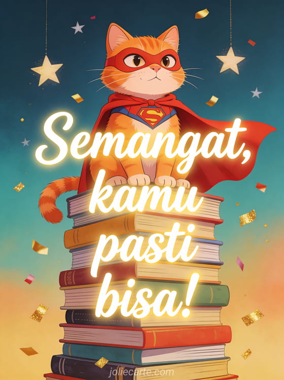 Tingkatkan kepercayaan diri seseorang sebelum ujian dengan kartu lucu ini yang menampilkan kucing oren berkostum superhero duduk di atas tumpukan buku raksasa. Temukan juga kartu keberuntungan ujian, kartu semangat ujian atau kartu semangat ujian.