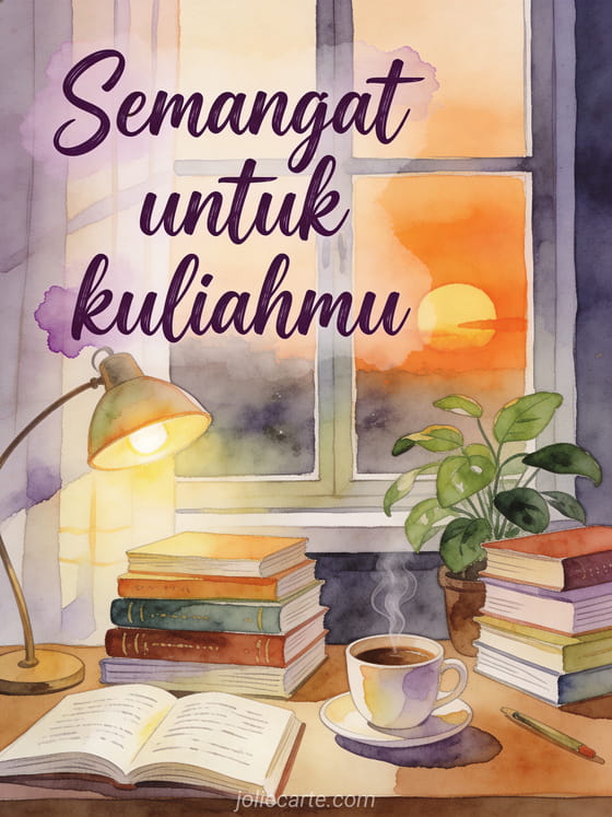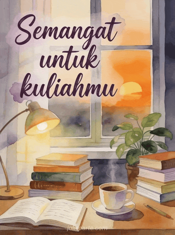 Semangati seseorang dalam kuliahnya dengan kartu hangat ini yang menampilkan meja nyaman dengan kopi mengepul dan tumpukan buku saat senja. Temukan juga kartu semangat ujian atau kartu animasi semangat.