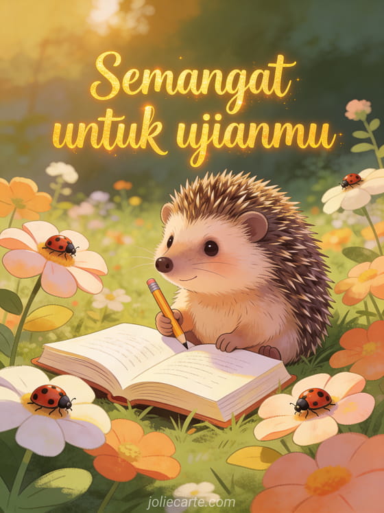 Semangati seseorang saat musim ujian dengan kartu menggemaskan ini yang menampilkan landak memegang pensil di samping buku terbuka di taman bunga. Temukan juga kartu semangat kuliah, kartu semangat ujian atau kartu animasi semangat.