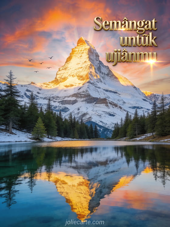 Inspirasi seseorang sebelum ujiannya dengan kartu megah ini yang menampilkan gunung bersalju saat matahari terbit dan danau cermin. Temukan juga kartu semangat ujian, kartu semangat kuliah atau kartu semangat ujian.