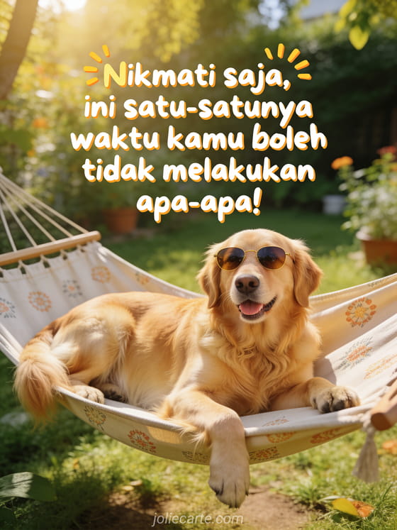 Kirim pesan lekas sembuh yang lucu kepada seseorang yang sedang pulih dan menikmati istirahat yang layak. Kartu fotorealistis ini dengan golden retriever bersantai di hammock dengan kacamata hitam akan mencerahkan harinya. Temukan juga sebuah kartu imut kucing superhero, sebuah kartu lucu tikus pemberani atau sebuah kartu lucu dokter Google.
