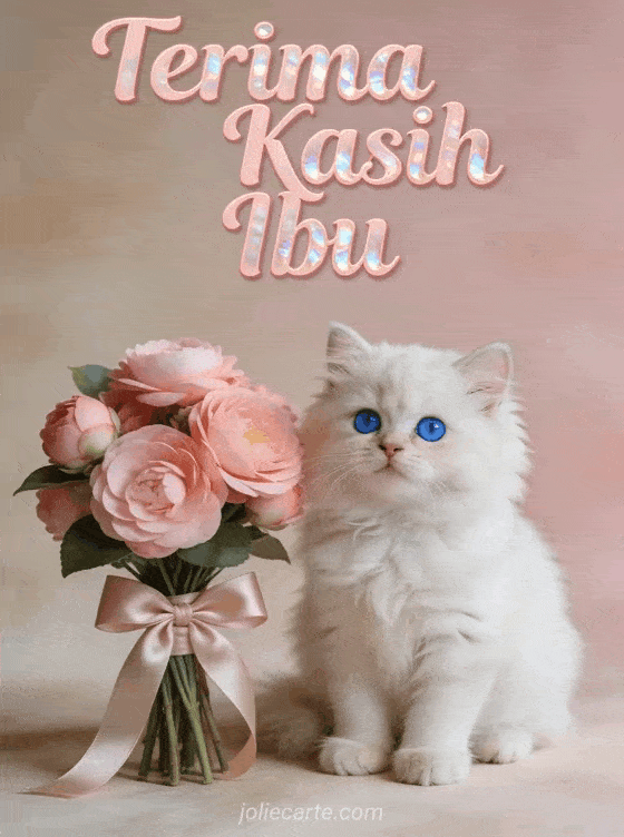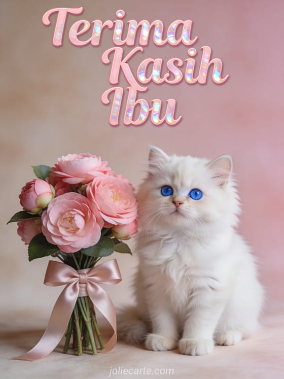Tunjukkan rasa terima kasih kepada ibu dengan kartu ucapan gratis yang menghangatkan hati ini. Anak kucing Persia putih bermata biru yang menggemaskan duduk di samping buket kamelia merah muda yang diikat pita satin, dengan latar belakang merah muda lembut. Temukan juga kartu bunga untuk Hari Ibu, kartu untuk Hari Ibu atau kartu dengan gambar untuk Hari Ibu.