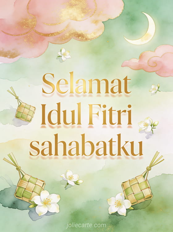 Sampaikan ucapan Idul Fitri yang penuh kasih dan doa untuk sahabat tercinta di hari kemenangan ini. Temukan juga ucapan lebaran untuk teman, ucapan idul fitri untuk keluarga, atau kartu ucapan lebaran untuk melengkapi perayaan.