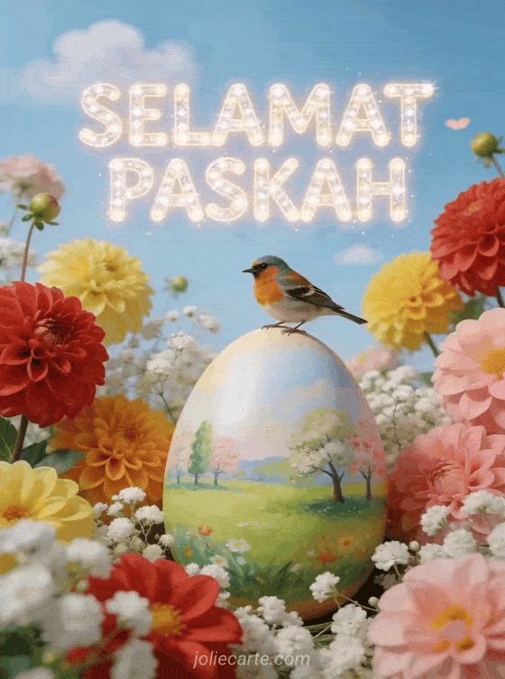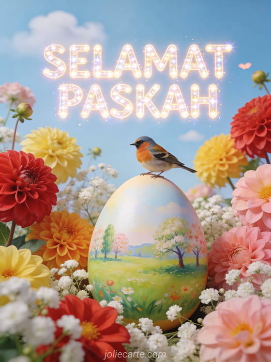 Cerahkan Paskah seseorang dengan kartu video yang memukau ini. Seekor burung goldfinch yang menawan bertengger di atas telur Paskah raksasa yang dilukis dengan pemandangan musim semi, dikelilingi dahlia berwarna cerah dan baby's breath di bawah langit yang lembut. Temukan juga kartu pesan Paskah atau kartu ucapan Paskah.