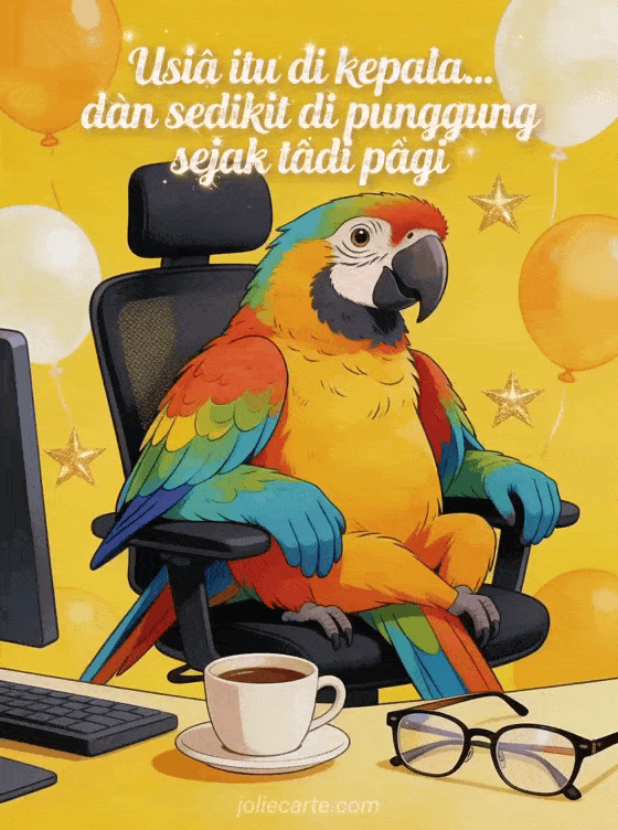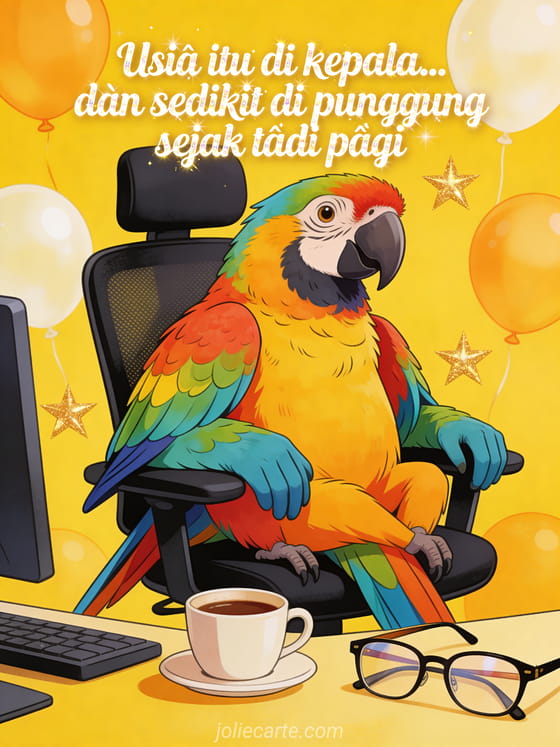 Kirim kartu ulang tahun kocak ini dengan burung beo warna-warni duduk di kursi kantor dengan cangkir kopi dan kacamata baca. Temukan juga kartu lucu ulang tahun berang-berang atau kartu glamor ulang tahun kucing.