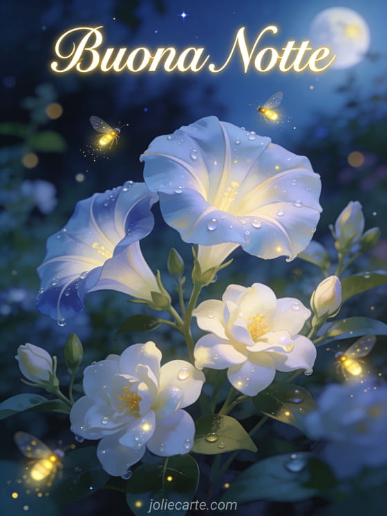 Buona Notte un sereno biglietto della buonanotte con fiori al chiaro di luna e lucciole