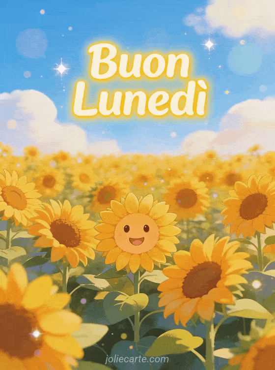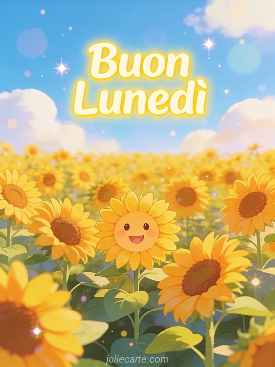 Illumina il lunedì di qualcuno con questa allegra cartolina Buon Lunedì con un campo di girasoli sotto un cielo azzurro. Scopri anche una cartolina inizio settimana, una cartolina lunedì soleggiato o una cartolina buon lunedì.