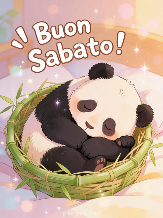 Invia un esilarante augurio di buon sabato con questa simpatica cartolina. Un panda assonnato che rifiuta di svegliarsi in un accogliente nido di bambù, il massimo della pigrizia del sabato. Scopri anche una cartolina di sabato con gatto in festa, una cartolina di sabato con gatto o una cartolina di sabato con rana.