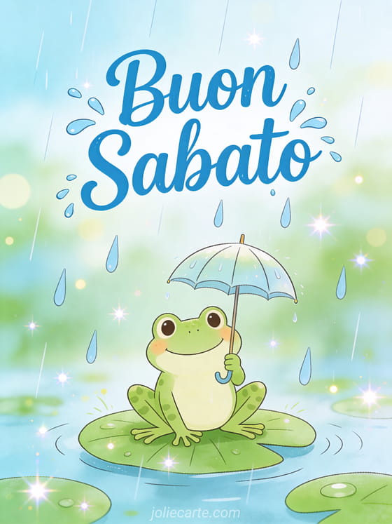 Invia un esilarante augurio di buon sabato con questa simpatica cartolina. Una rana allegra con un piccolo ombrello su una foglia di ninfea in un comico giorno di pioggia, portando gioia e risate per iniziare il fine settimana.
