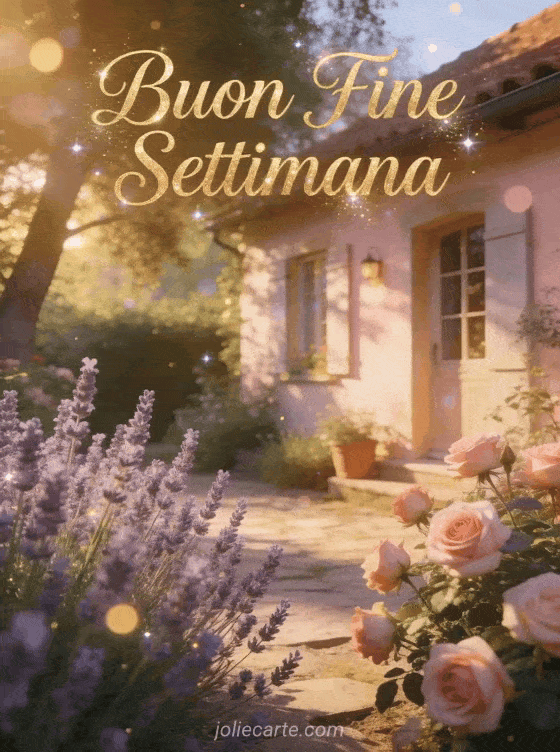 Invia un bellissimo augurio di buon fine settimana a qualcuno di speciale. Un accogliente giardino con lavanda e rose in fiore, immerso nella calda luce del sole pomeridiano. Scopri anche un biglietto weekend con baci o un biglietto weekend divertente.