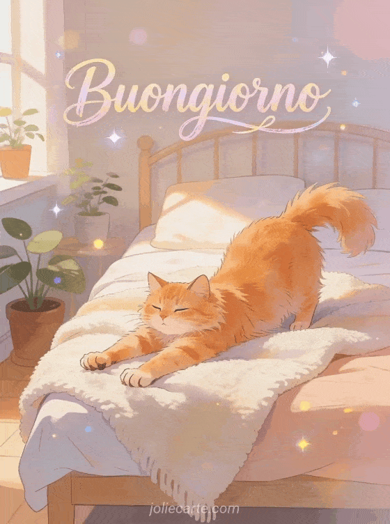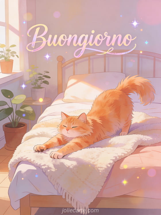 Inizia il mattino di qualcuno con calore con questo adorabile biglietto di buongiorno. Un soffice gatto arancione si stiracchia pigramente su una coperta accogliente, con la calda luce del mattino che crea ombre morbide in una camera da letto tranquilla. Scopri anche un biglietto di buongiorno divertente.