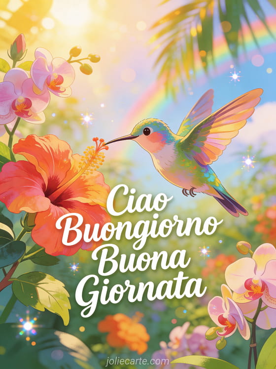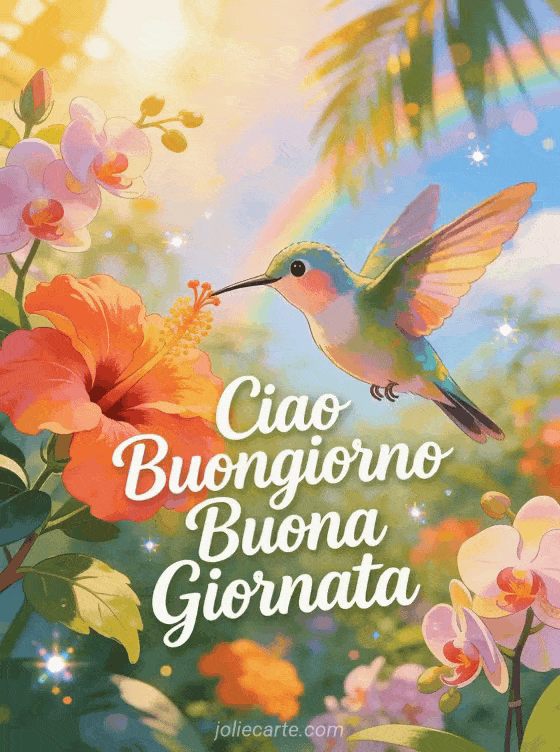 Rallegra la mattina di qualcuno con questo vivace saluto di ciao e buongiorno. Scopri anche una cartolina ciao animata, una cartolina ciao buona giornata con baci o una cartolina ciao simpatica.