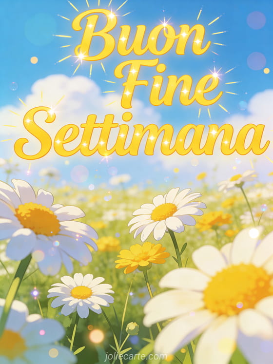 Invia un allegro augurio di buon fine settimana per rallegrare la giornata di qualcuno. Un bellissimo prato estivo pieno di margherite bianche e gialle sotto un cielo azzurro con soffici nuvole, immerso nel sole splendente. Scopri anche un biglietto weekend divertente con procione o un biglietto weekend con giardino.