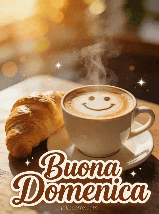 Invia un accogliente augurio di buona domenica con questa dolce cartolina. Un cappuccino perfetto con artistica latte art sorridente e un croissant fresco accanto, immersi nella luce del mattino. Scopri anche una cartolina di domenica con gattini o una cartolina di domenica con baci.