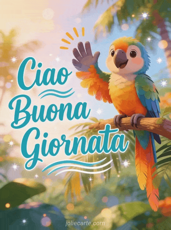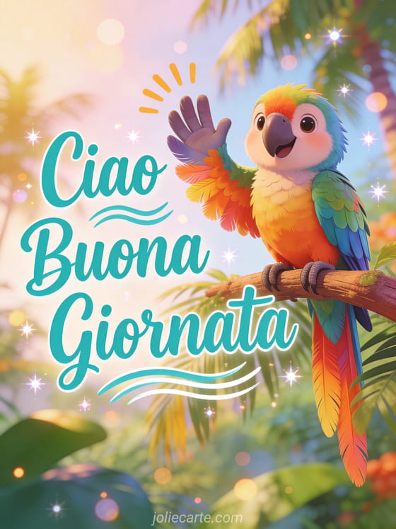 Invia un colorato ciao buona giornata per salutare con energia tropicale e buon umore. Scopri anche un buona giornata allegra, un buona giornata soleggiata o un buongiorno sereno.