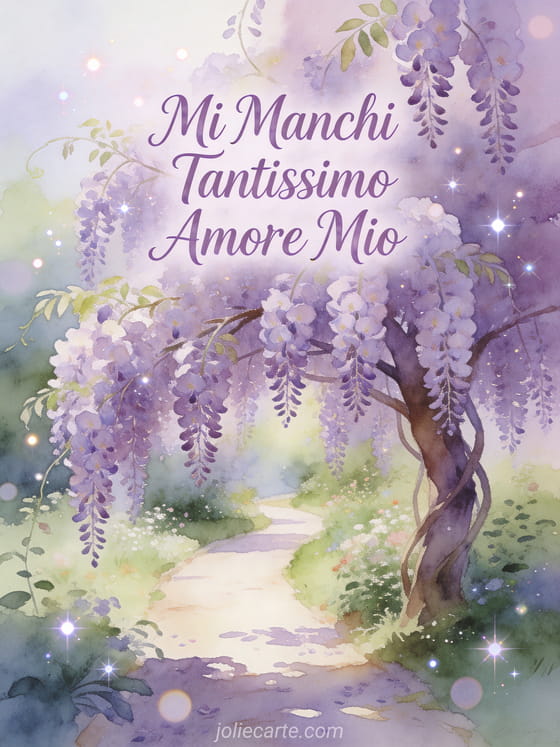 Invia questo romantico biglietto con un bellissimo albero di glicine in piena fioritura con fiori viola lungo un sentiero del giardino. Scopri anche un biglietto penso a te mi manchi o un biglietto ti amo mi manchi.